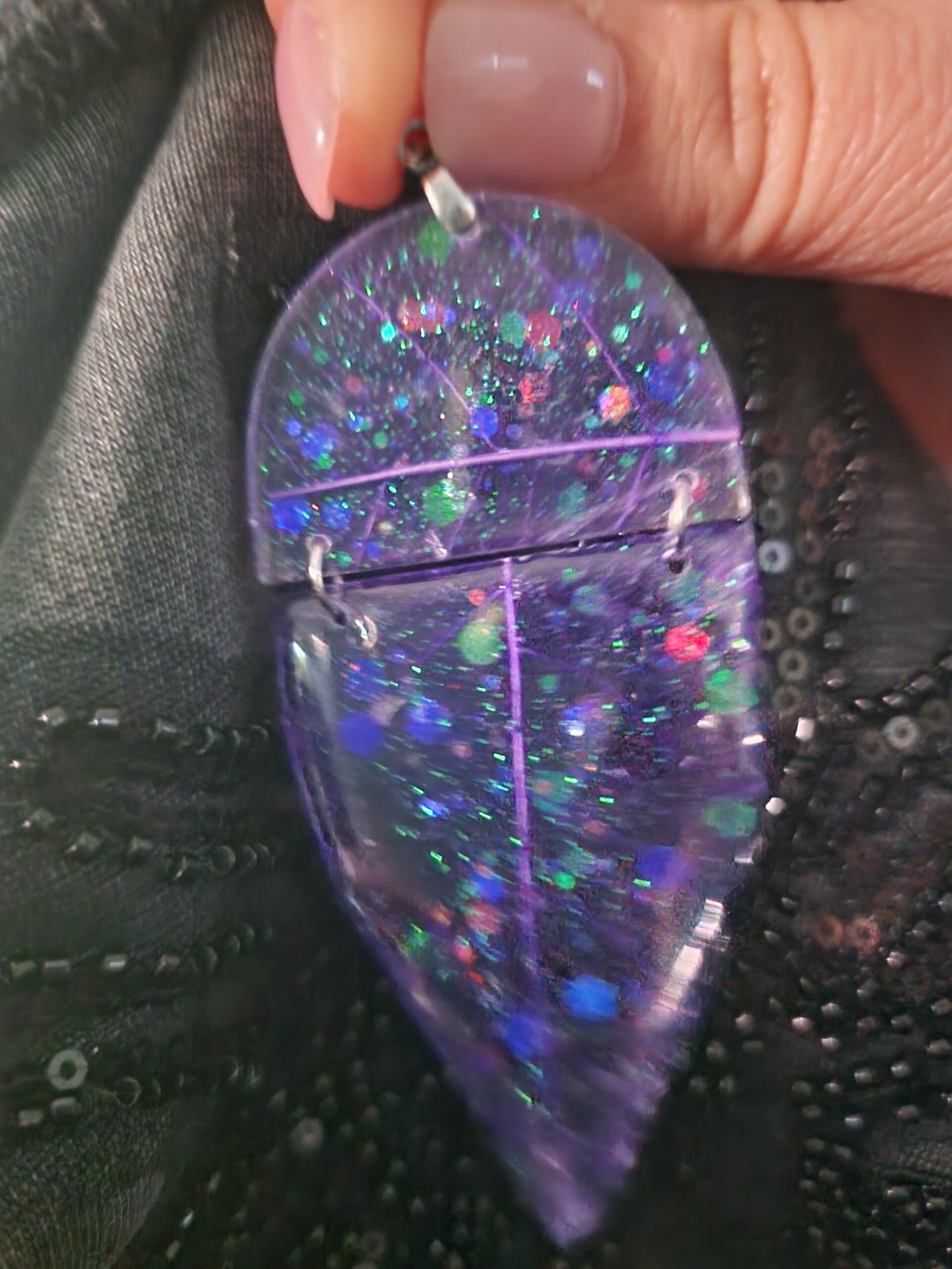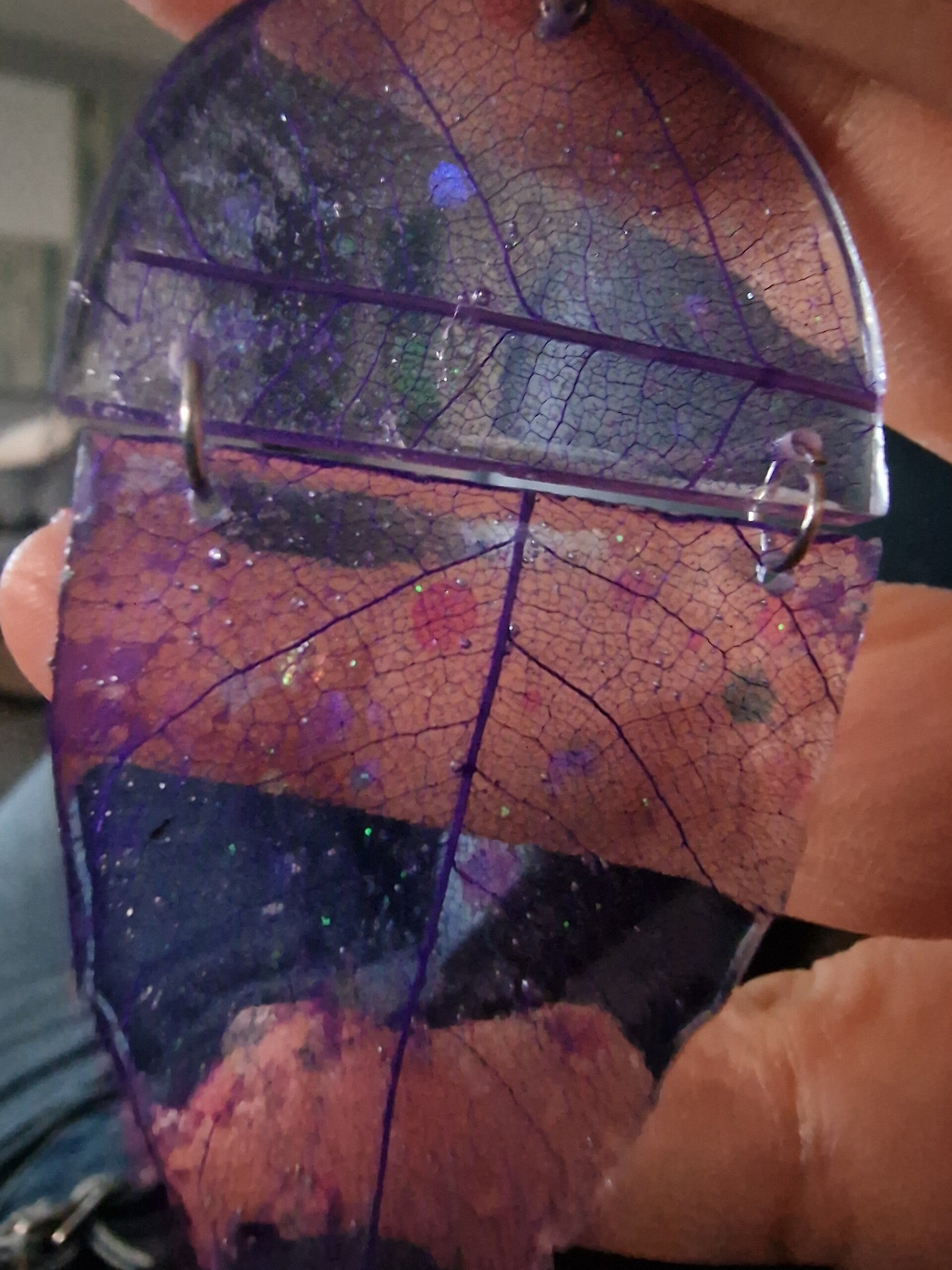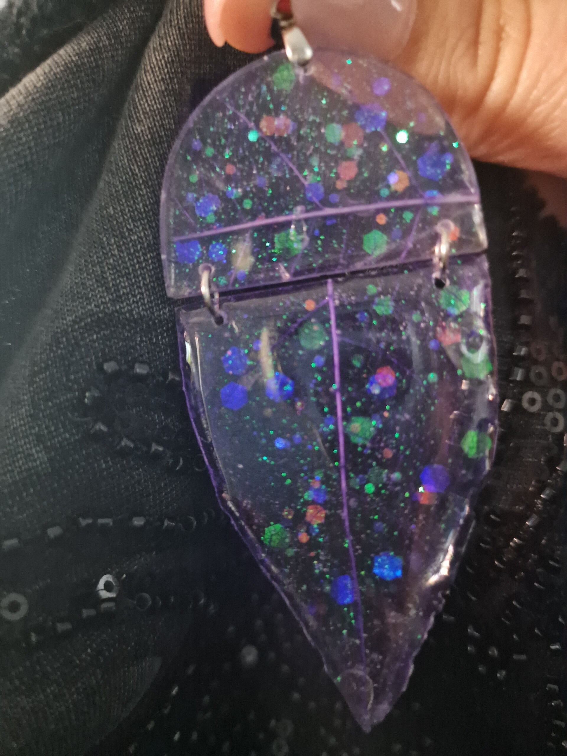 Réalisé à la main en résine, ce bijou révèle les nervures fines d’une véritable feuille, sublimées par une teinte violette lumineuse et des paillettes multicolores scintillantes. Sa conception en deux parties lui apporte un mouvement subtil et élégant, qui attire délicatement le regard.